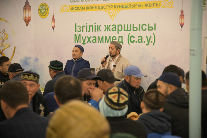 Бас имам Қасым Әшімов жамағатқа Пайғамбарымыз (оған Алланың салауаты мен сәлемі болсын) мәуліті жайлы кіріспе сөз сөйлеп, жамағаттың көкейінен орын алған мәуліт жырларының оқылатындығын айтты. Мәуліт жырын Медеу ауданының бас имамы Данияр қари Жұмабаев және Ақжолтай қари оқыды. Пайғамбарымыздың (оған Алланың салауаты мен сәлемі болсын) ғибратқа толы өнегілі ғұмыры жайлы Нұр-Мүбарак университетінің оқытушысы, доцент Алау Әділбаев көркем жеткізе білді. Игі шара соңынан дұға жасап, бата берді.