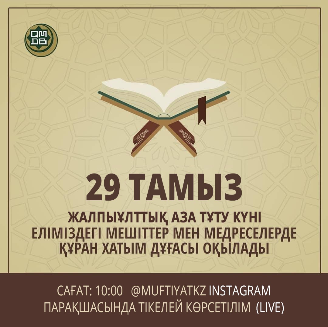 Осыған орай 29 тамыз жексенбі күні таңғы сағат 10:00-де еліміздің барлық мешіттерінде Жамбыл облысының Байзақ ауданында оқ-дәрілер қоймасындағы өрт пен жарылыстардың салдарынан адамдардың қазаға ұшырауына байланысты олардың рухына бағышталып Құран Хатым дұғасы оқылады.