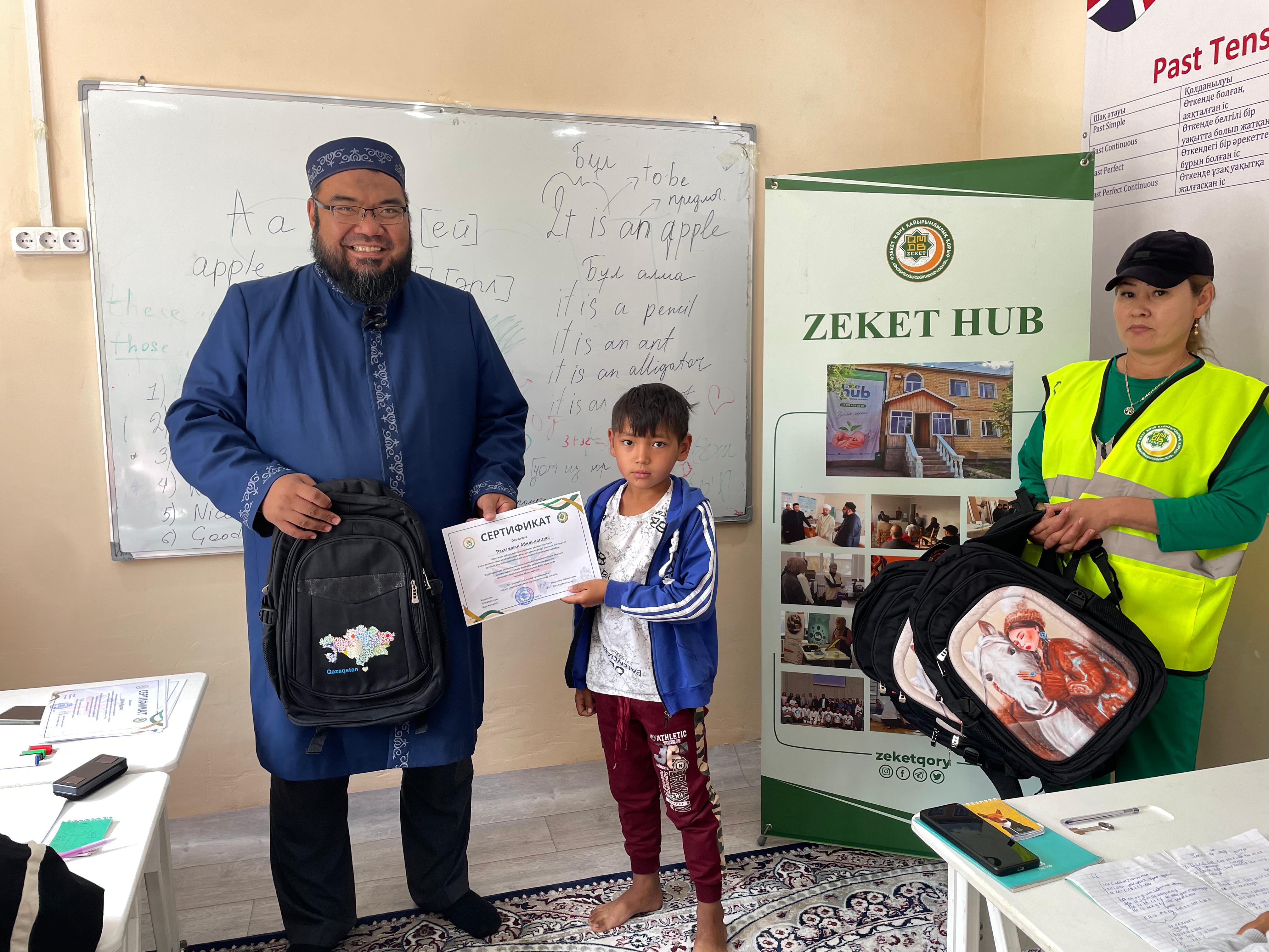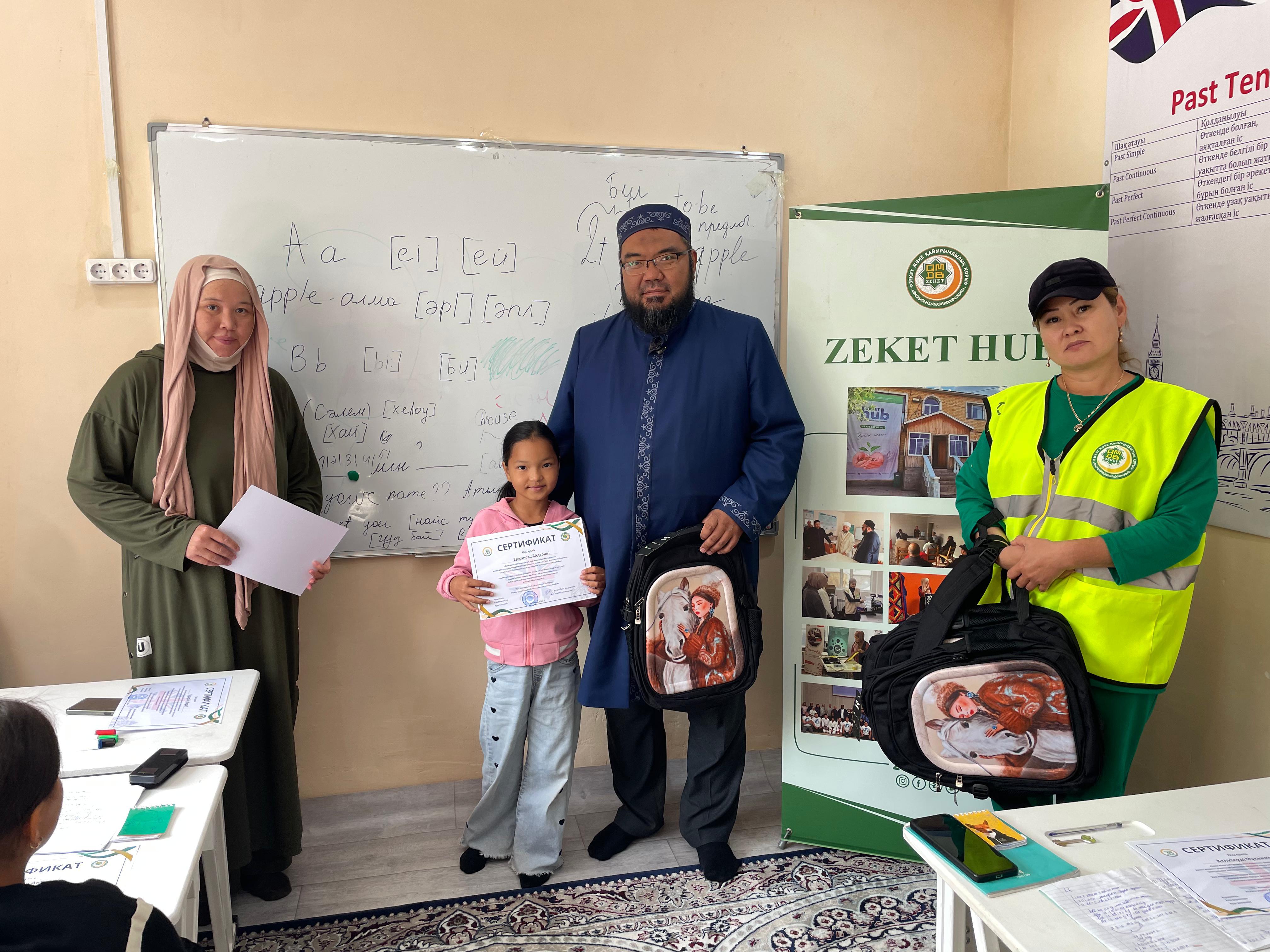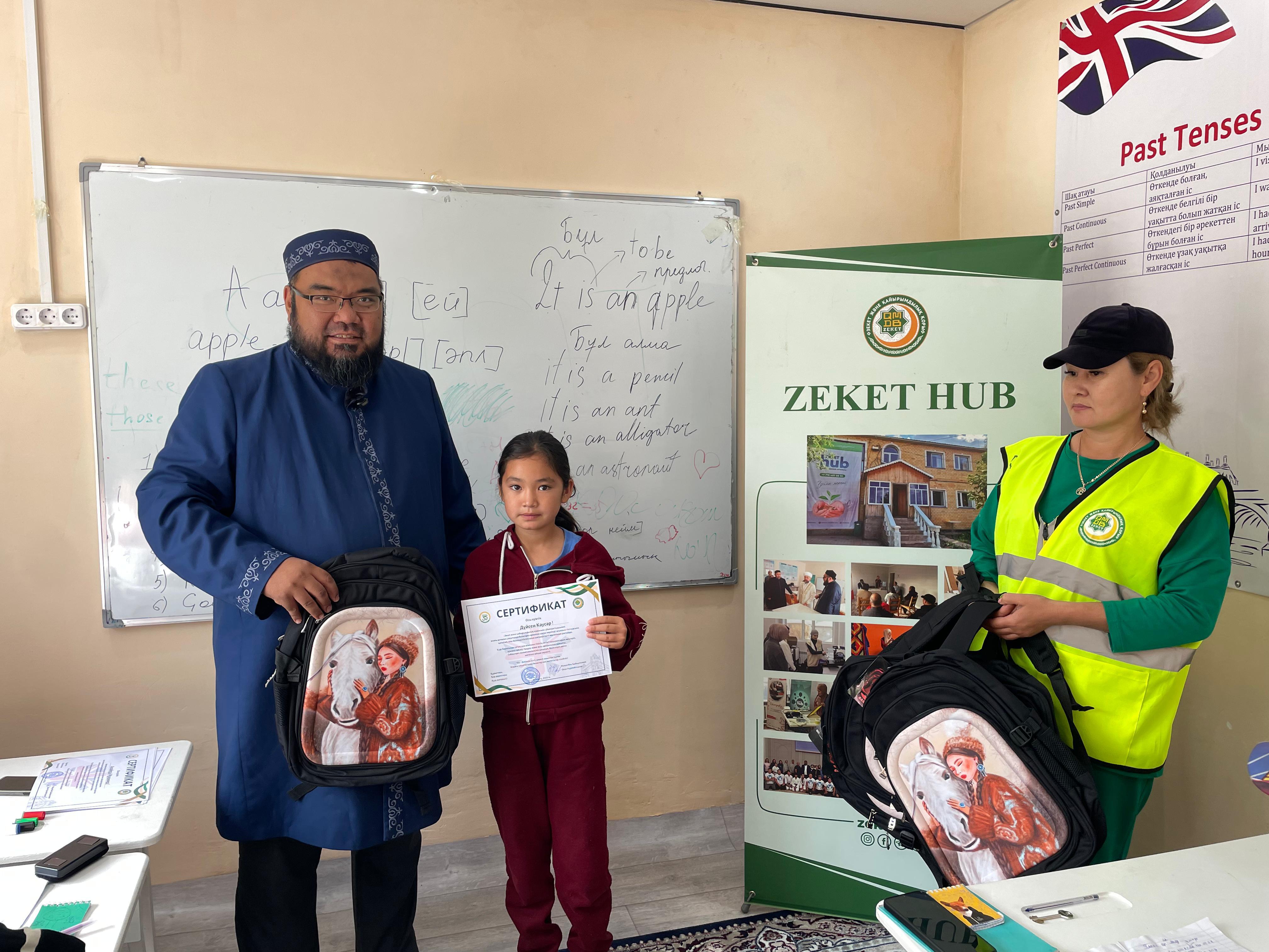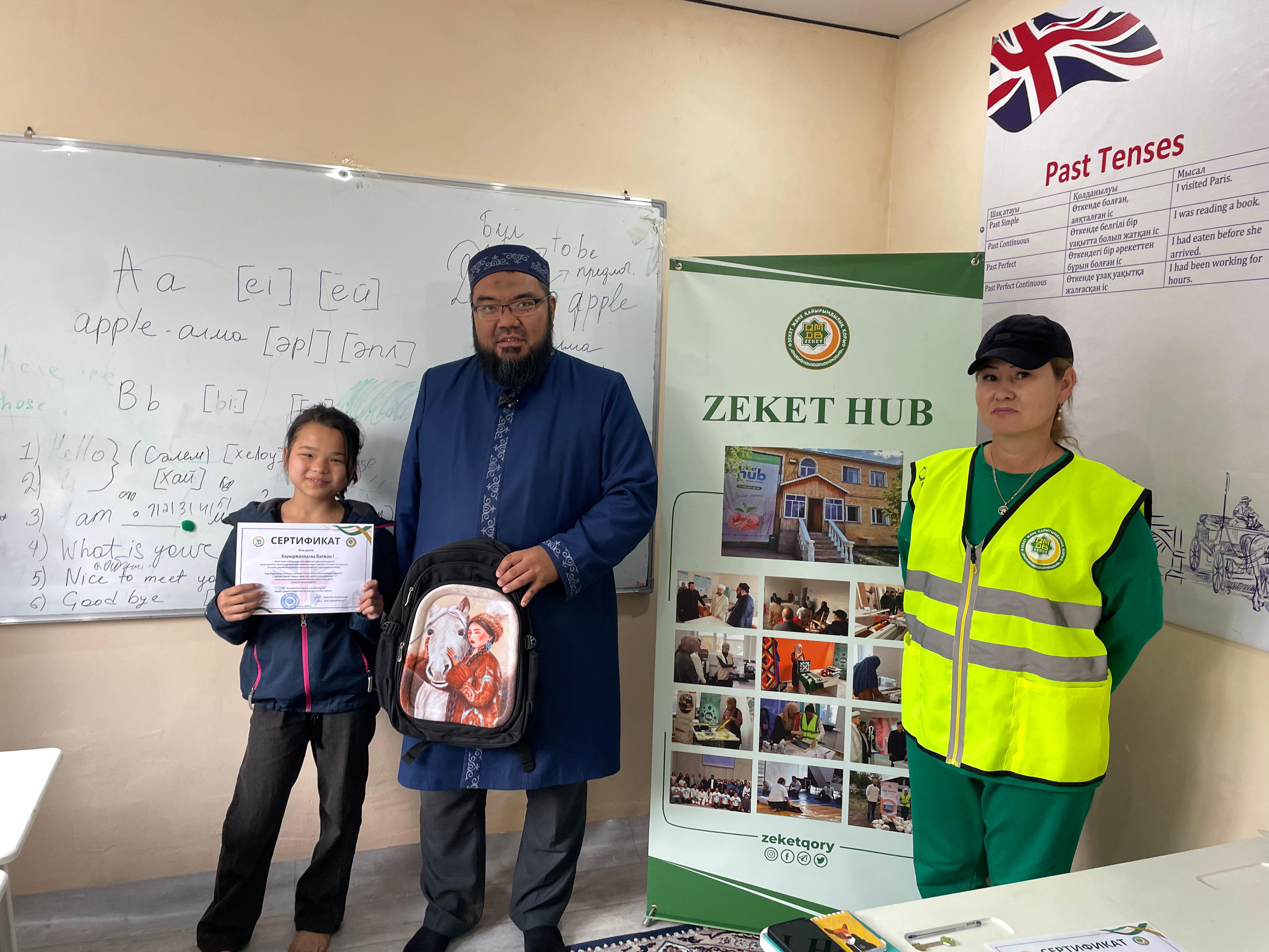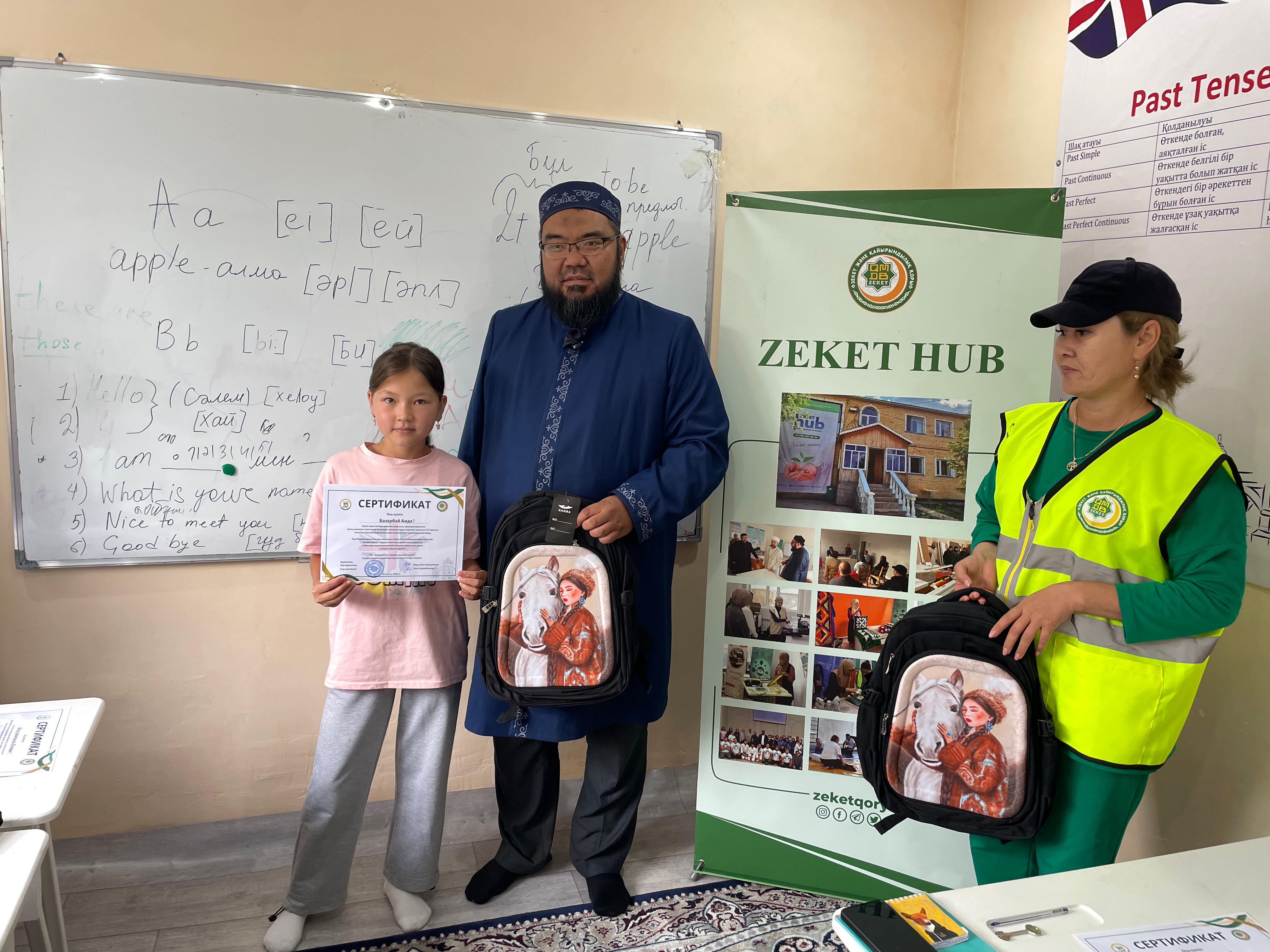 Қысқа мерзімді ағылшын тілі курсында білім алған оқушыларға Қор директоры Мақсатбек Қайырғалиев арнайы сертификаттар мен Zeket Hub орталығында әзірленген Zeket-ai сөмкелерін табыстады.