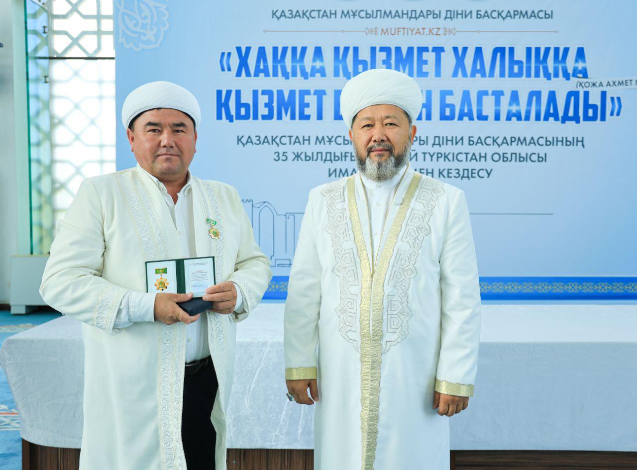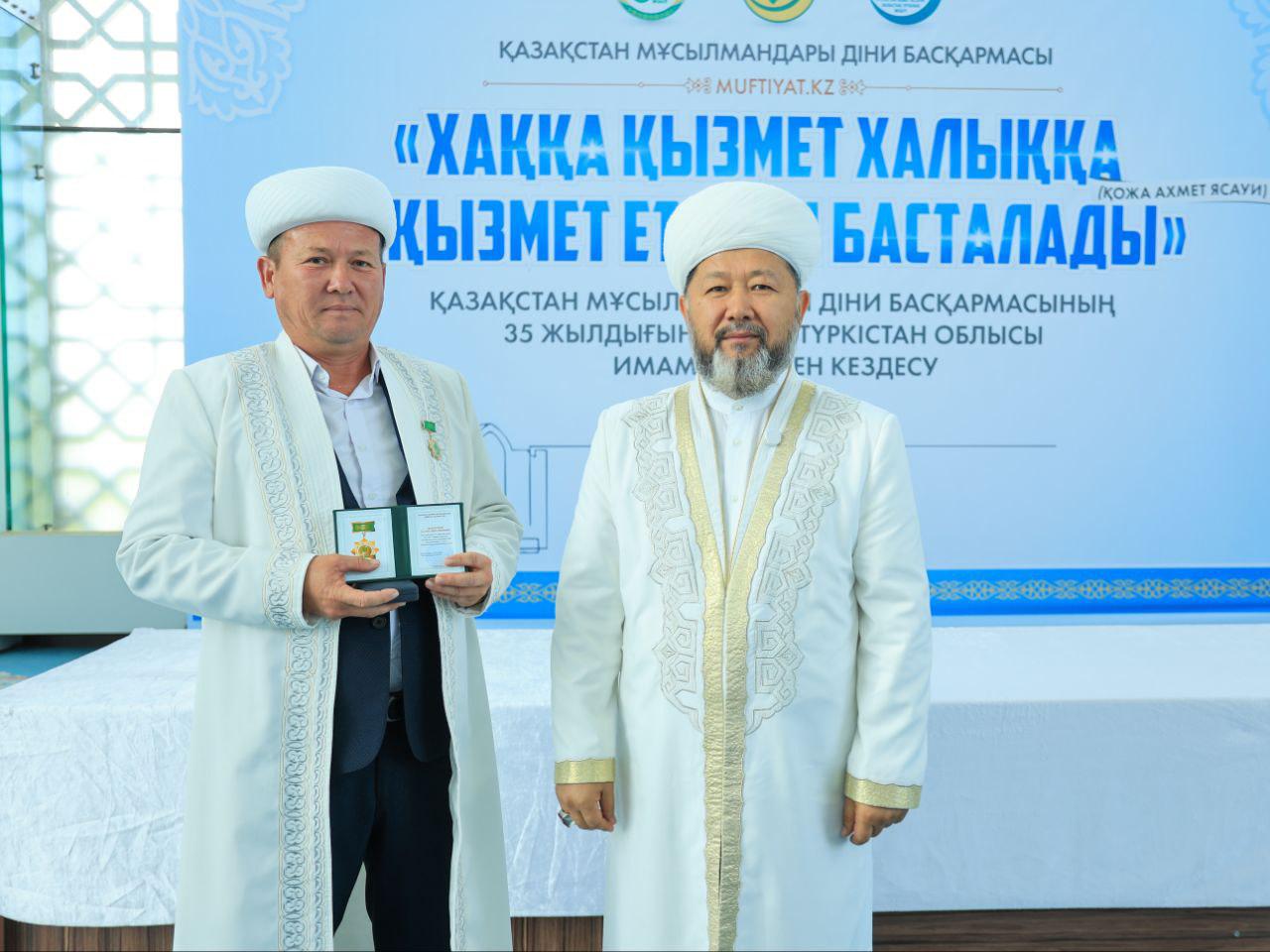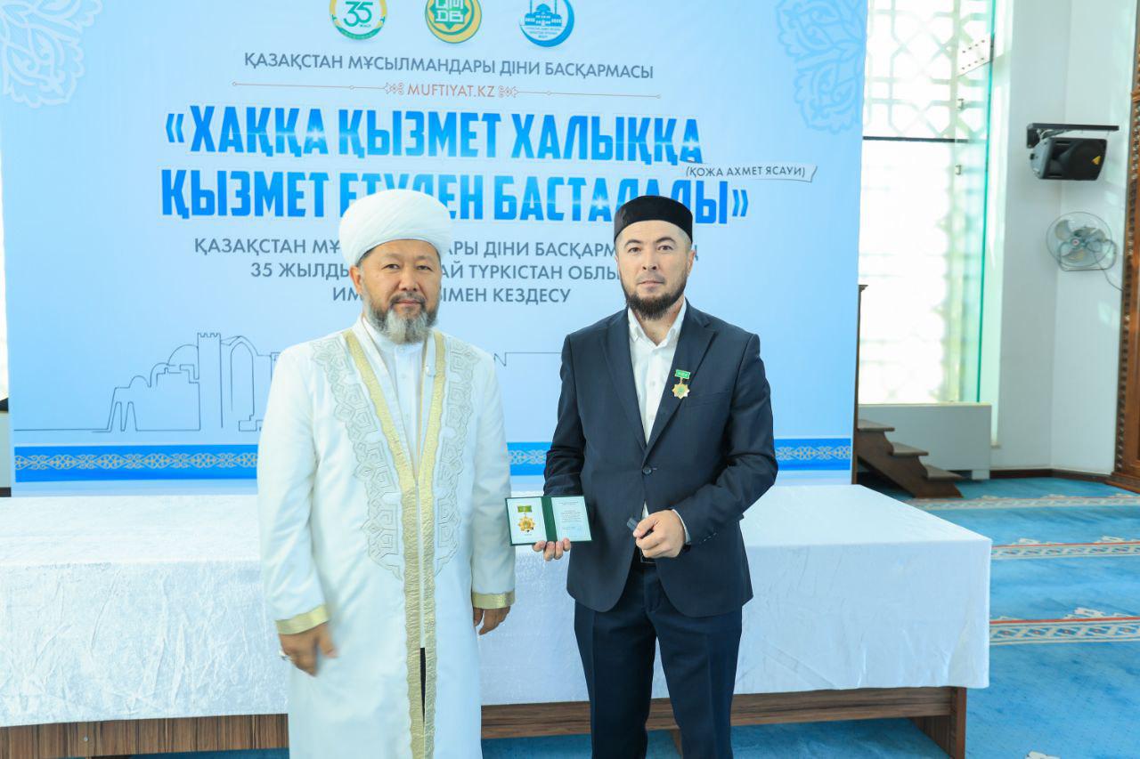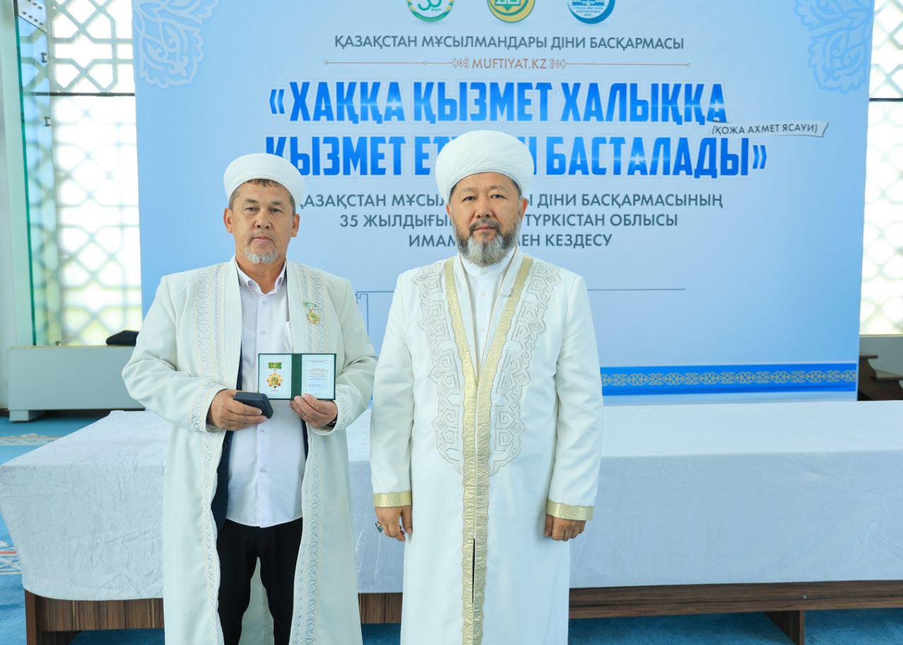 Кездесу соңында ҚМДБ-ның 35 жылдық мерейтойына орай дін саласында ұзақ жылдар бойы табанды қызмет етіп келе жатқан Түркістан облысының бірқатар ардагер имамдары мерекелік медальмен марапатталды.