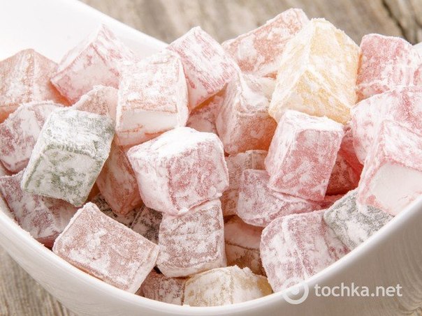 Сахар с водой доводим до кипения, добавляем лимонный сок и тонкой струйкой всыпаем крахмал, интенсивно перемешивая, варим до загустения . В плоскую форму насыпаем половину фисташек, заливаем получившейся массой, посыпаем сверху оставшимися фисташками и даем остыть. Когда масса остыла, нарезаем ее крупным кубиком и сверху посыпаем сахарной пудрой.