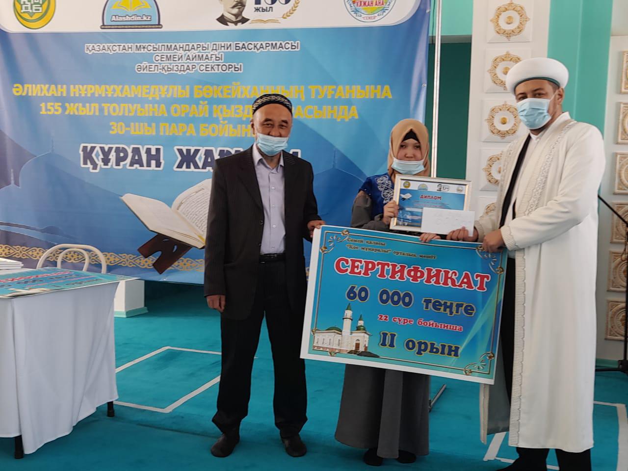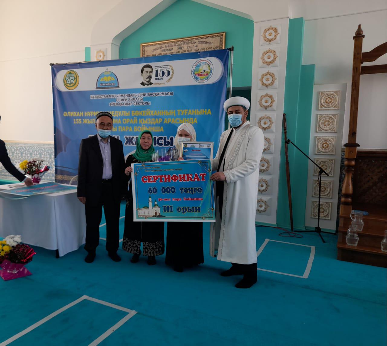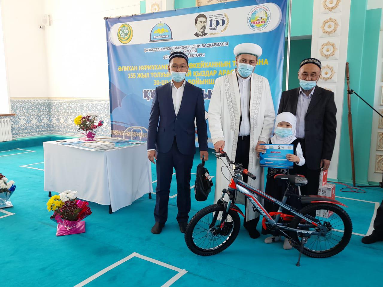 По итогам лучшие участницы были награждены призами. Главный имам Аскар Абитайулы поблагодарил всех конкурсанток и вручил денежные средства, специальные подарки и благодарственные письма. Также были вручены специальные призы и благодарственные письма самым юным участницам.