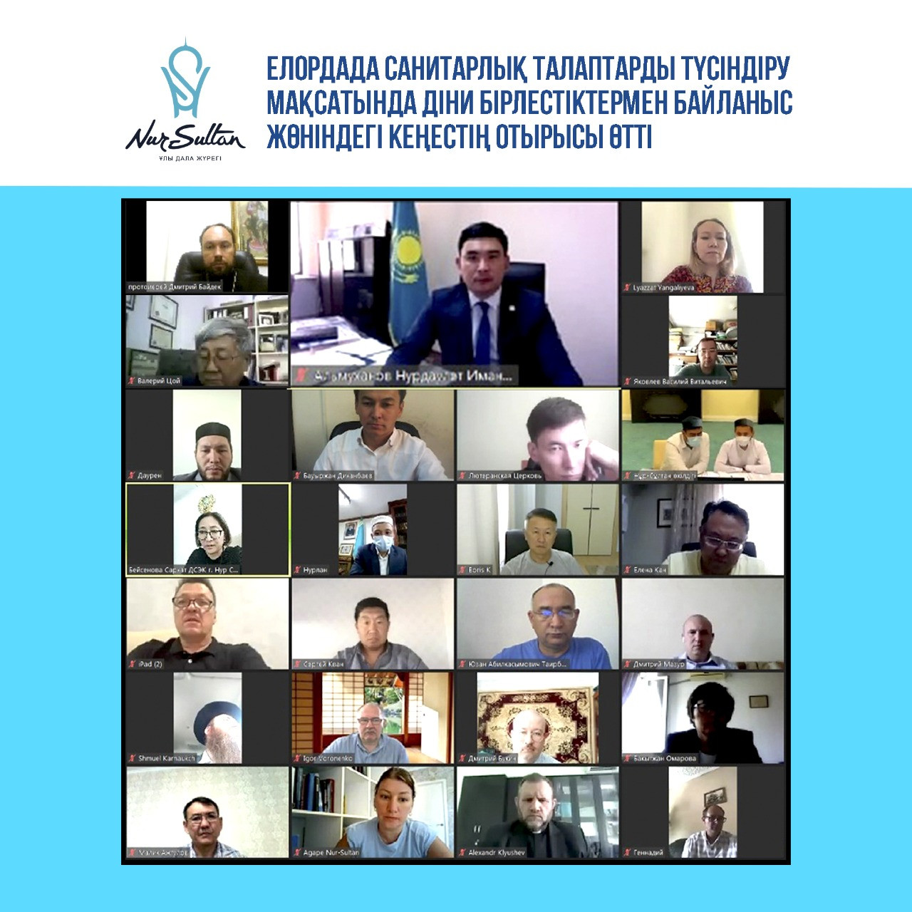 Онлайн-встречу провел глава столичного управления по делам религий Нурдаулет Альмуханов. Он подчеркнул необходимость организации работы религиозных объединений в рамках проекта «Ashyq».